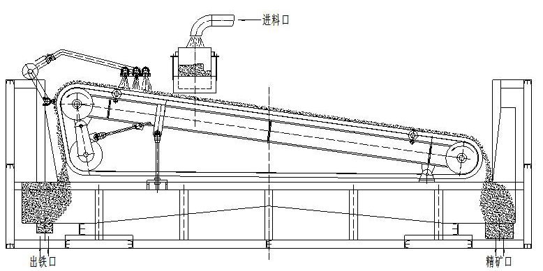 平板磁選機采用的帶式分選結(jié)構(gòu),在整個的工作區(qū)域從進料到出料,物料在皮帶的的帶動下,可對物料進行多次的磁攪拌,同時在水流的的沖洗作用下,把不含磁的的尾礦除去,帶有磁性的的礦物被皮帶輸送到板選機的的脫磁區(qū),從而將帶有磁性的的礦物通過脫磁裝置脫掉,來完成選礦的的過程,整機功率小、處理大,磁場強度高,并達到很好的的品質(zhì),能夠獲得更大的的效益。